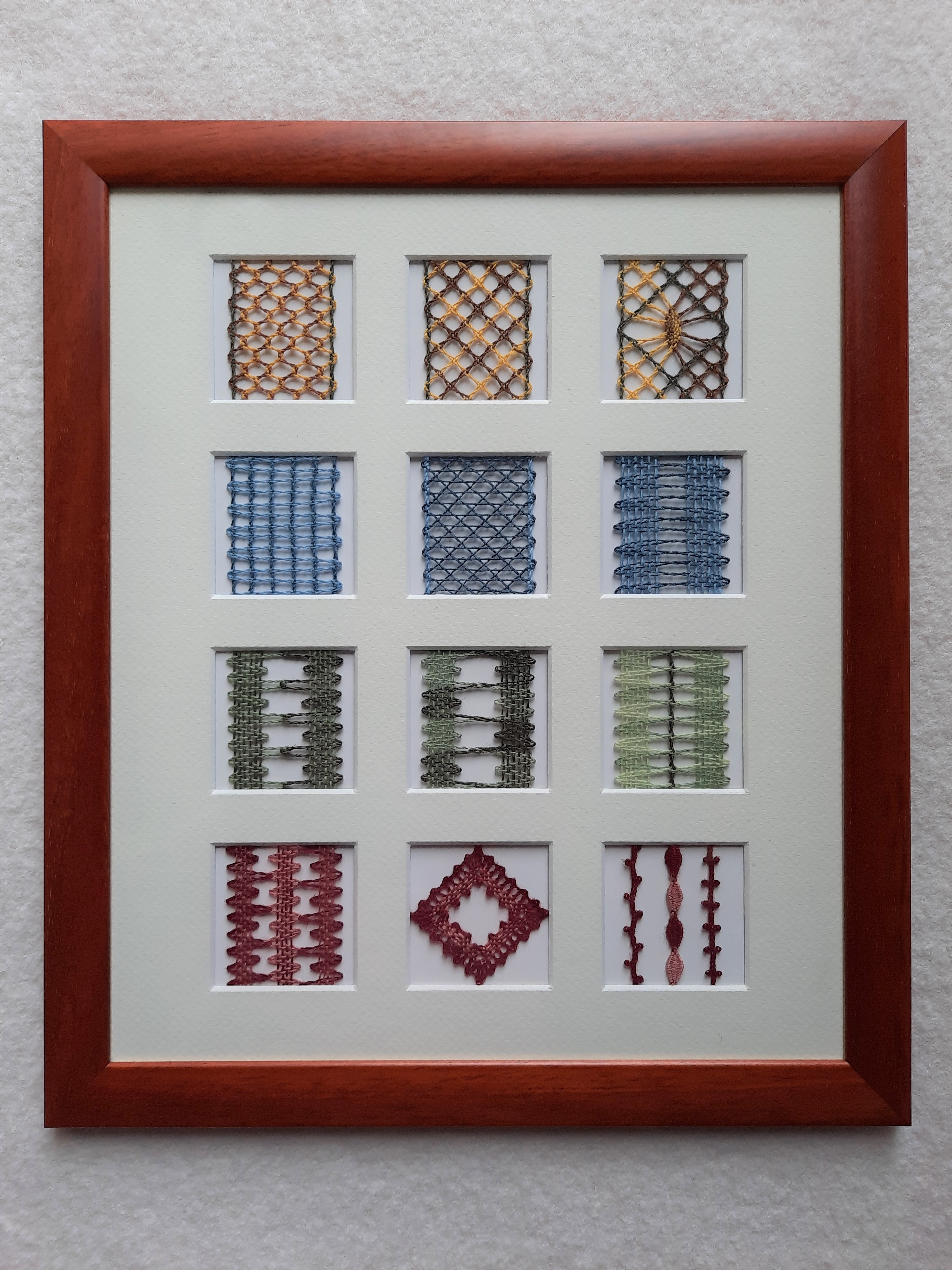 Holzrahmen mit Glasscheibe passgenau zum Passepartout für alle Muster des Online-Klöppelkurses "Grundlagen des Klöppelns"